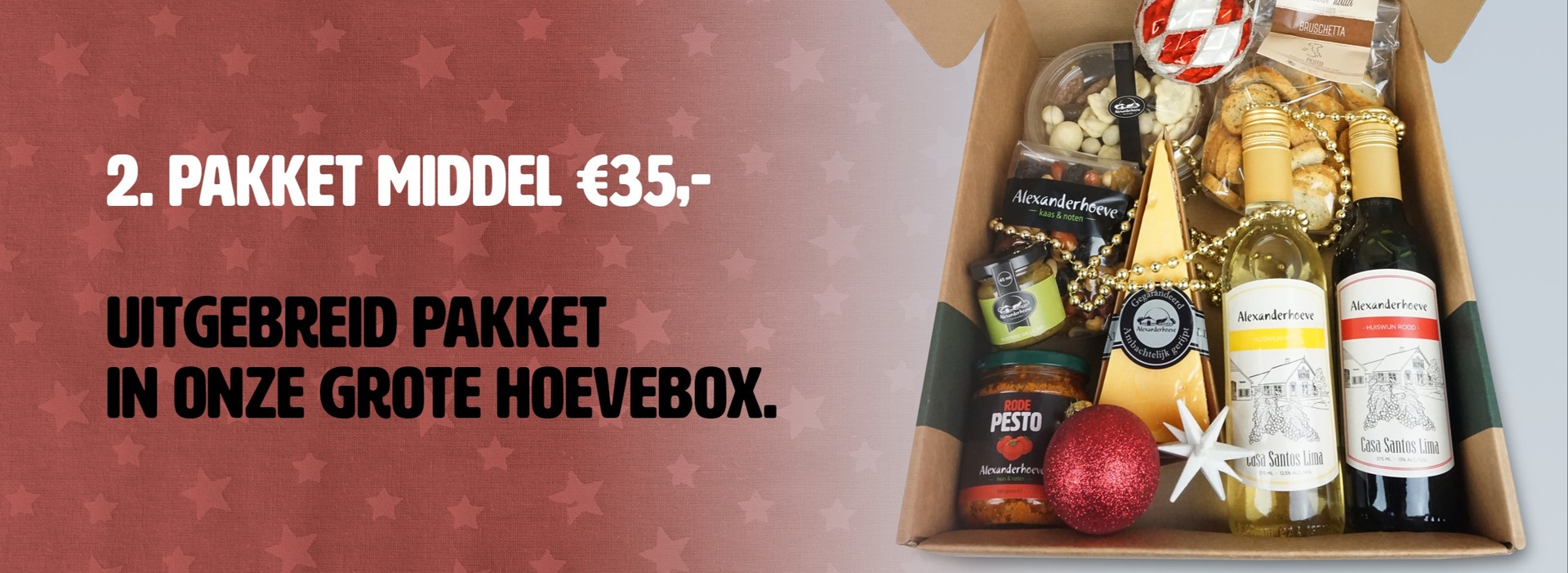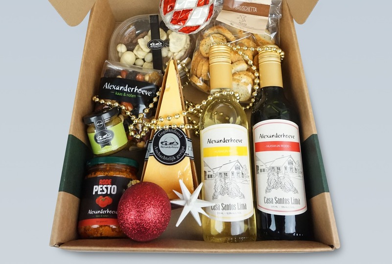 Het geheel is zorgvuldig en feestelijk verpakt in een grote Hoevebox.
